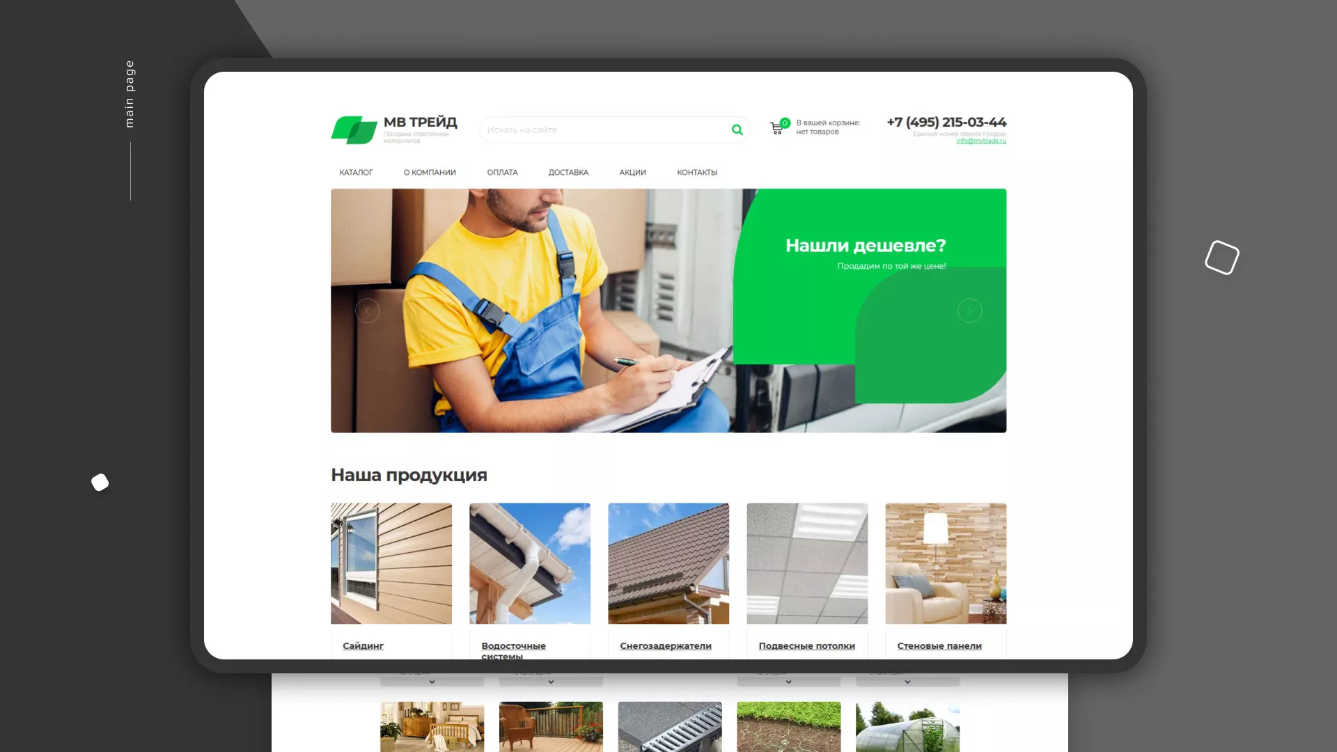 Компания «МВ Трейд» осуществляет продажу сайдинга и отделочных материалов через интернет со своих складов в Белоозёрском. За 17 лет компания зарекомендовала себя надежным поставщиком. Товары реализуются как оптом, так и в розницу.