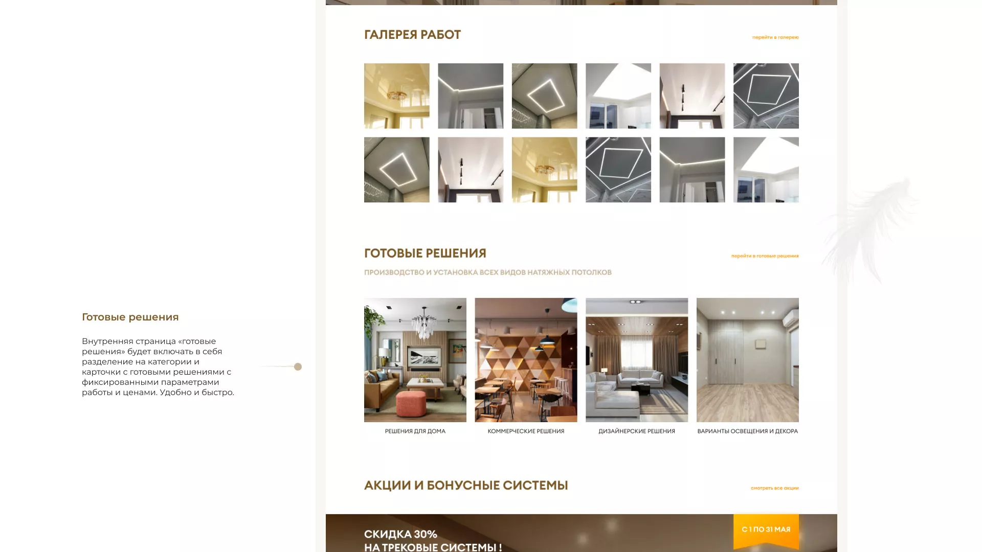 Что мы сделали. Разработали сайт в теплых и уютных «шоколадных» тонах. Продумали структуру, наполнили ее удобными разделами такими как «готовые решения», которые включают в себя не только уже готовые варианты с фиксированной ценой, но и разделение по категориям: решения для дома, коммерческих помещений, интересные дизайнерские решения. Так же предложили клиенту онлайн-калькулятор, что может существенно упростить потенциальным заказчикам нашего клиента в Белоозёрском заказ потолков.
