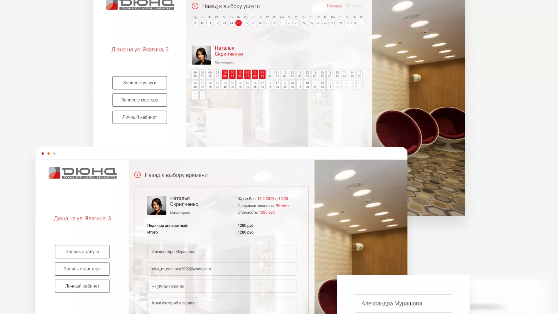 В разделе «Личный кабинет» содержатся все текущие записи в салоны красоты в Белоозёрском, с возможностью их отмены. Также, здесь можно редактировать свои персональные данные, ознакомиться с историей записей и видеть бонусы и акции салонов красоты.