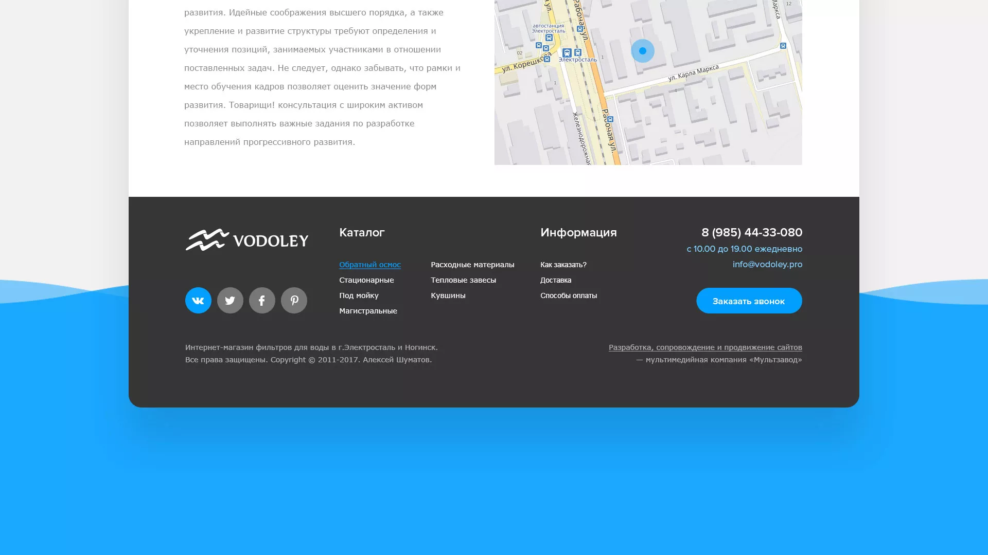Работать с компанией «Мультзавод» удобно и легко, поэтому, если Вам требуется создание аналогичного сайта по продаже и установке фильтров очистных сооружений в Белоозёрском, мы предложим Вам действительно выгодные цены и удобные условия сотрудничества. Мы обещаем, что вложенные в разработку сайта деньги окупятся и Вы получите современный рабочий интернет-магазин!